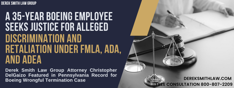 As seen in the Pennsylvania Record Attorney Christopher J. DelGaizo is representing a long-time employee of The Boeing Company, John Fisher in a wrongful termination lawsuit. John Fisher who worked as a former Sheet Metal Assembler for nearly 35 years, was diagnosed with Chronic Eczema and Acute Folliculitis in fall 2022. Fisher applied for leave under the Family and Medical Leave Act (FMLA) which was approved, but he then experienced significant changes at work.
